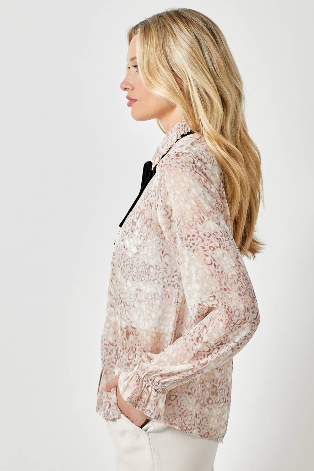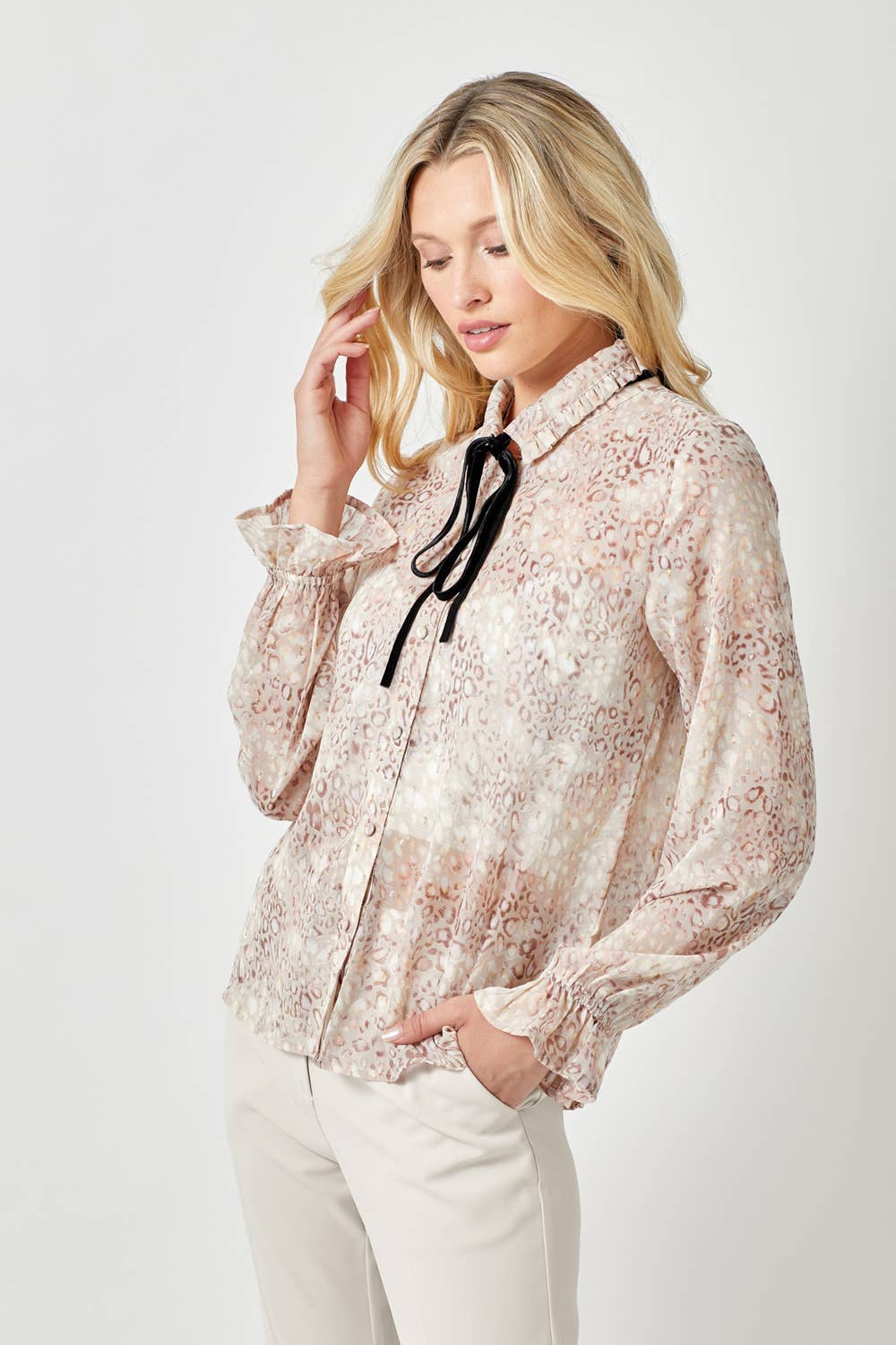 Tie neck button-down blouse.