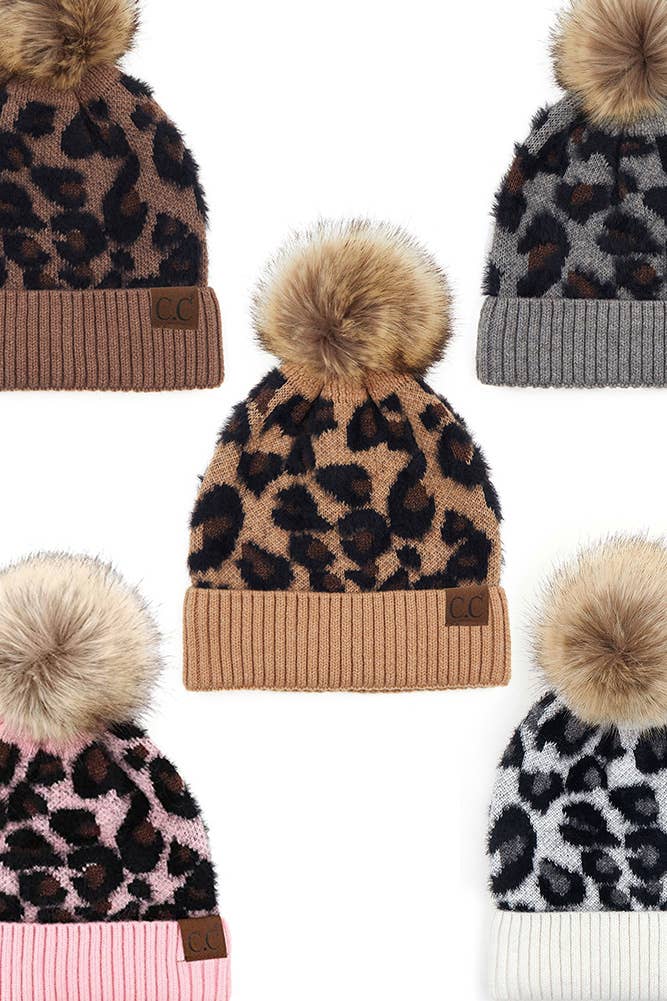 C.C Leopard Pattern Beanie Hat with Pom Winter Hat
