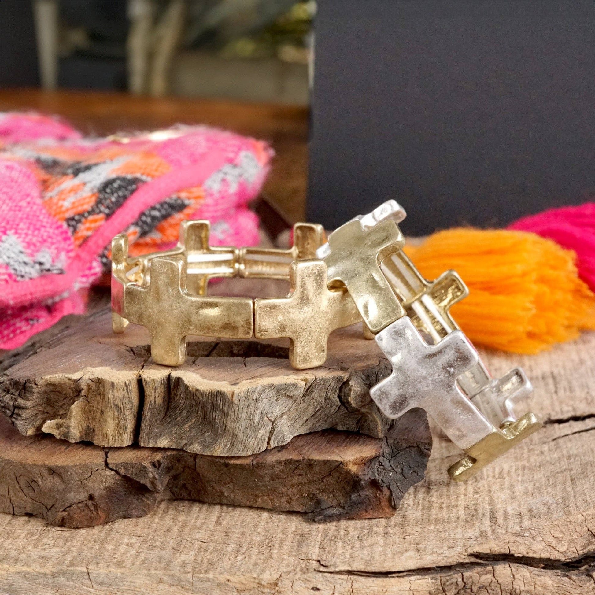 This Hammered Sideways Cross Bracelet brings a bold, boho flair to any look with its distinctive hammered cross design. A perfect statement piece, it features large sideways crosses and a comfortable, stretchy fit.