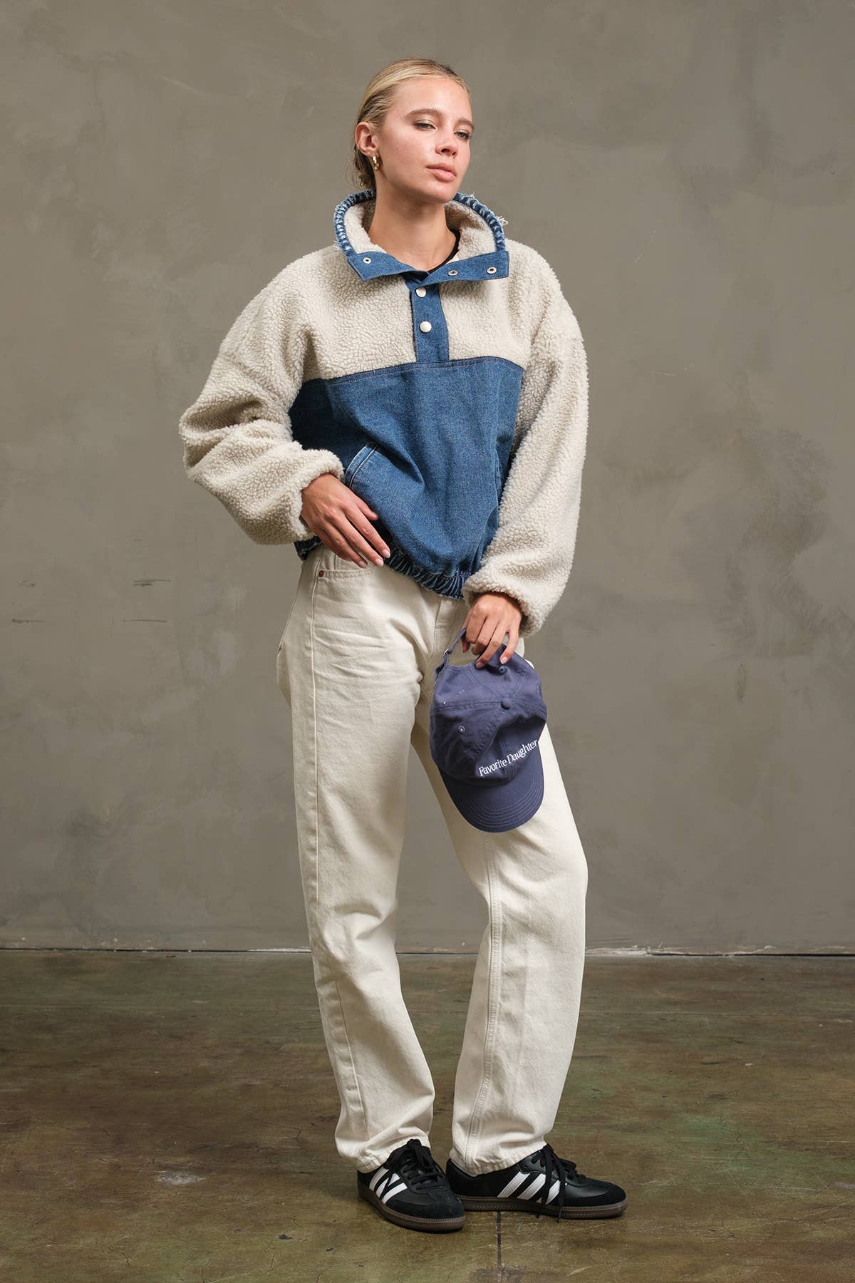 A cozy pullover jacket featuring soft teddy fleece sleeves and top, contrasted with mid-wash denim body.